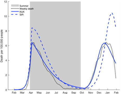 Figure 1: Weekly deaths from Covid-19 per 100,000 people in Sweden from the beginning of February 2020 to the end of January 2021, actual and predicted from a purely epidemiological model (SIR) and one that combines epidemiological and economic forces (KUX)