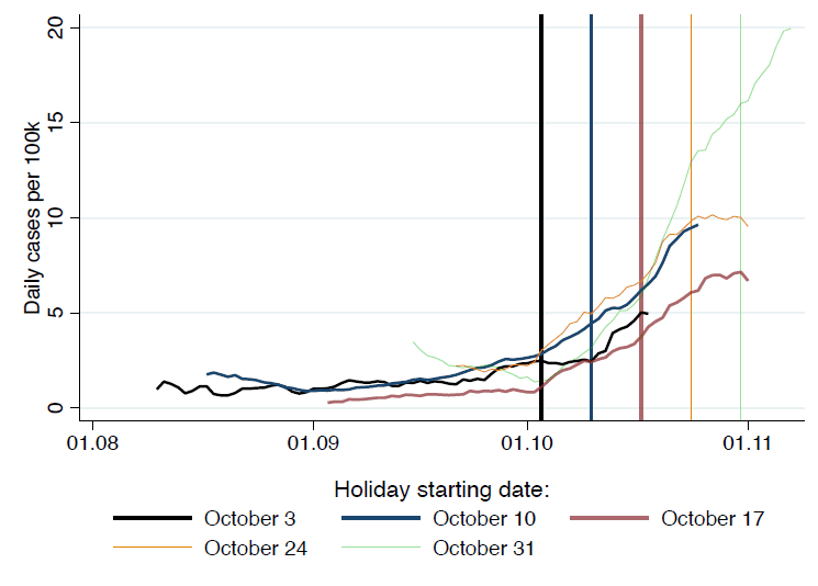 The new study tackles this problem by comparing the evolution of infection rates across 415 districts in Germany, where school holidays started at different times in the summer and autumn of 2020. A causal interpretation of such comparisons is possible as the timing of holidays was set years in advance, it was unaltered by the pandemic and it did not coincide with other containment measures.