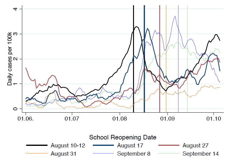 Instead, infections appear to have increased in the last weeks of the summer holidays and decline in the days after re-opening (see Figure 2). The researchers consider this to be best explained by a higher risk of infection of families returning home from their travels shortly before the summer holidays ended and increased testing.