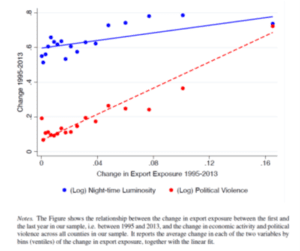 Figure 1 summarises the results. It plots the average change in economic activity and political violence across all counties and countries in the sample (vertical axis) against exposure to trade liberalisation (horizontal axis) as determined by crop suitability and salience of agricultural tariff cuts.