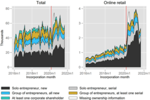 The online retail sector disproportionately contributed to this increase: despite the sector’s modest size in the total number of firms (2%), it contributed up to 2,000 of a total increase in 10,000 registrations per month. In other words, online retail accounts for 20% of excess entry during the pandemic.