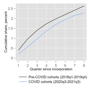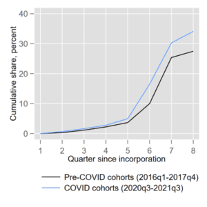 This is reflected in Figure 3, left panel, which shows the cumulative quarterly share of new businesses posting a job in Indeed in their first eight quarters after incorporations, for cohorts of firms born during versus before the pandemic. Firms born during the pandemic are less likely to post a job within the first year of their existence than firms born in the two years prior to the crisis (the blue line is significantly below the black line).